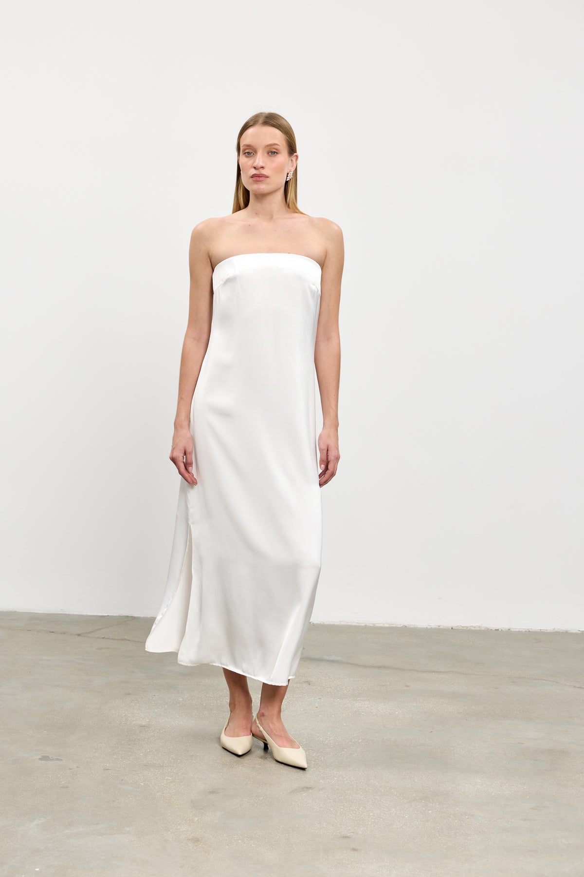 שמלת סטרפלס בגזרה ישרה עם שסע צידי מבד סאטן משי נשפך ואלגנטי
