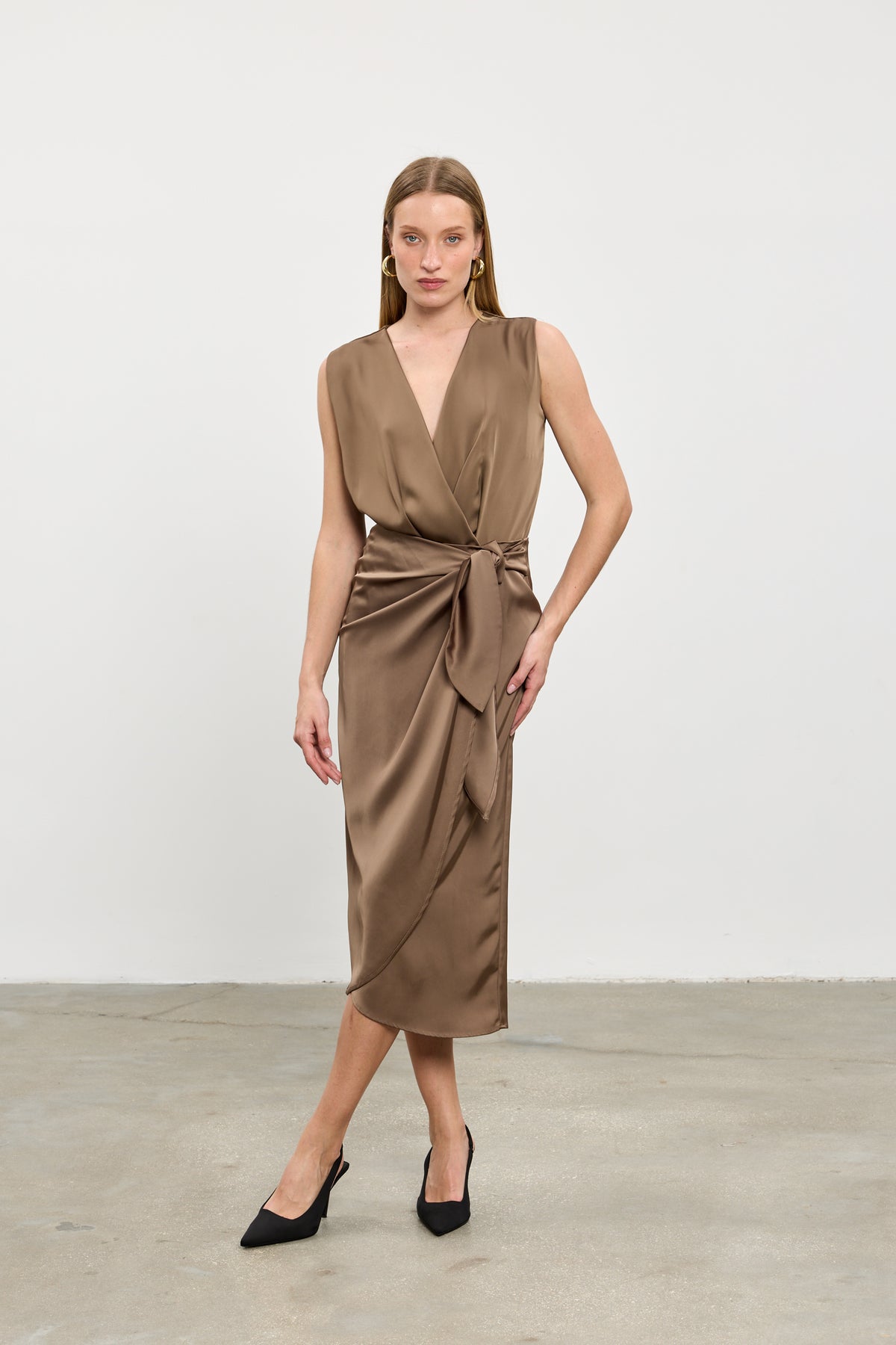 גזרת מעטפת קלאסית ללא שרוול מבד משי בגימור סאטן איכות, בגד גוף אוסף ומחזיק את המחשוף מבד לייקרה דק ועדין הנסגר עם תיקתקים.
