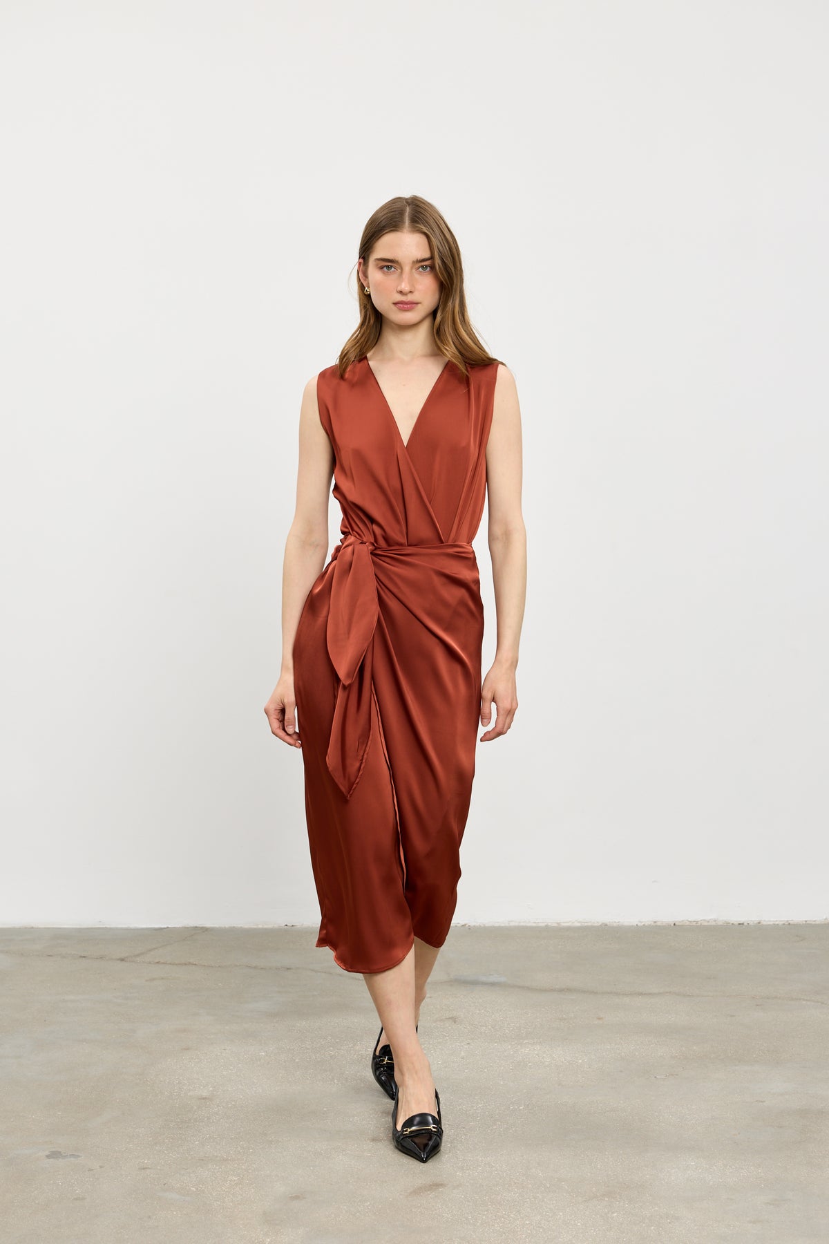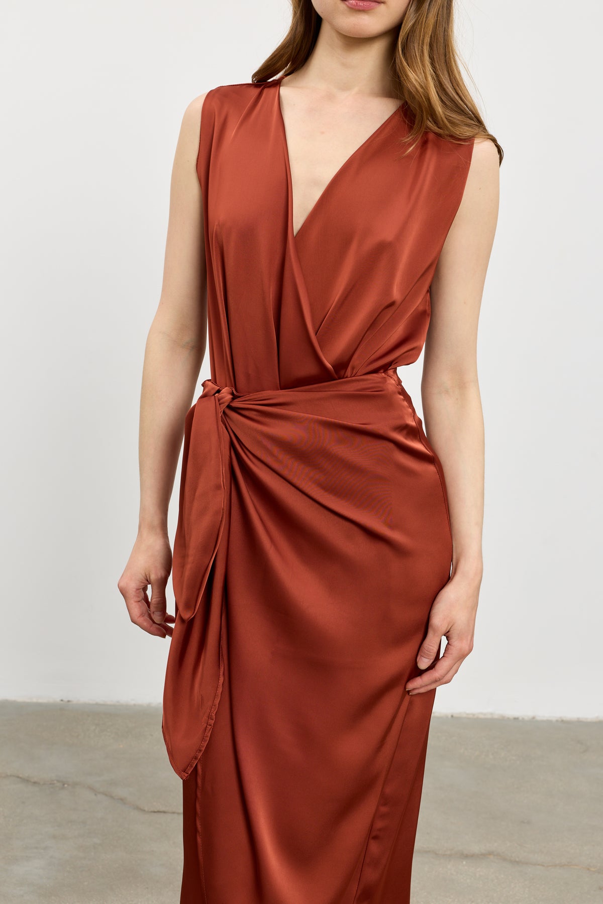 גזרת מעטפת קלאסית ללא שרוול מבד משי בגימור סאטן איכות, בגד גוף אוסף ומחזיק את המחשוף מבד לייקרה דק ועדין הנסגר עם תיקתקים.