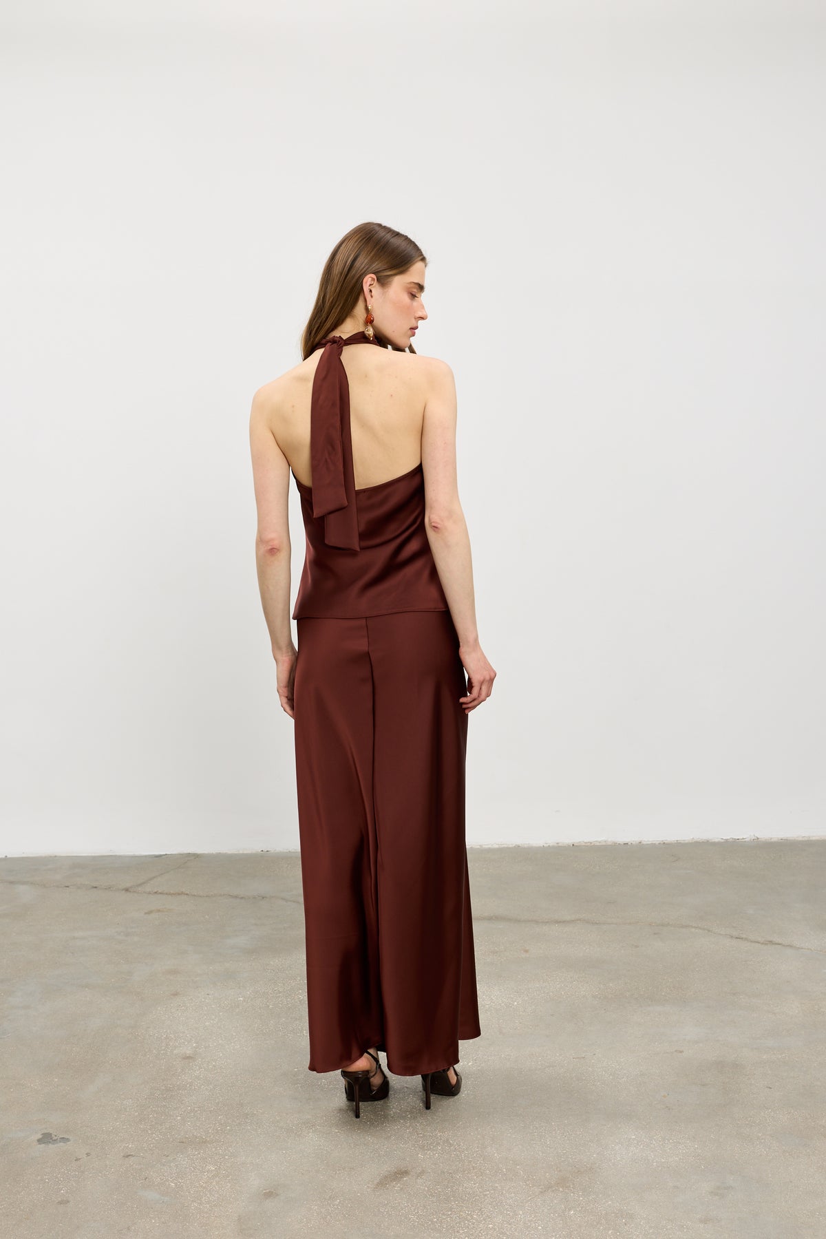 החצאית גזורה בטכניקת אלכסון אשר נותנת לבד נפילה מרשימה על הגוף ומונחת בצורה מחמיאה.