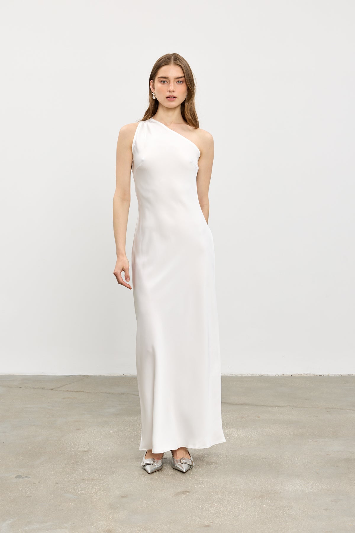השמלה גזורה בטכניקת אלכסון אשר מאפשרת נפילה מחמיאה ומרשימה של הבד על הגוף, עשויה בד סאטן משי איכותי ולא מתקמט